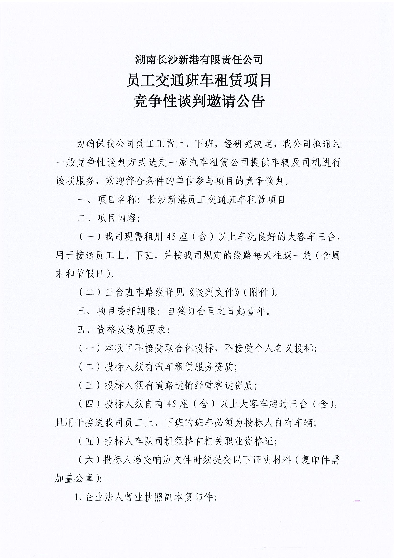 湖南長(zhǎng)沙新港有限責(zé)任公司 員工交通班車租賃項(xiàng)目競(jìng)爭(zhēng)性談判邀請(qǐng)公告