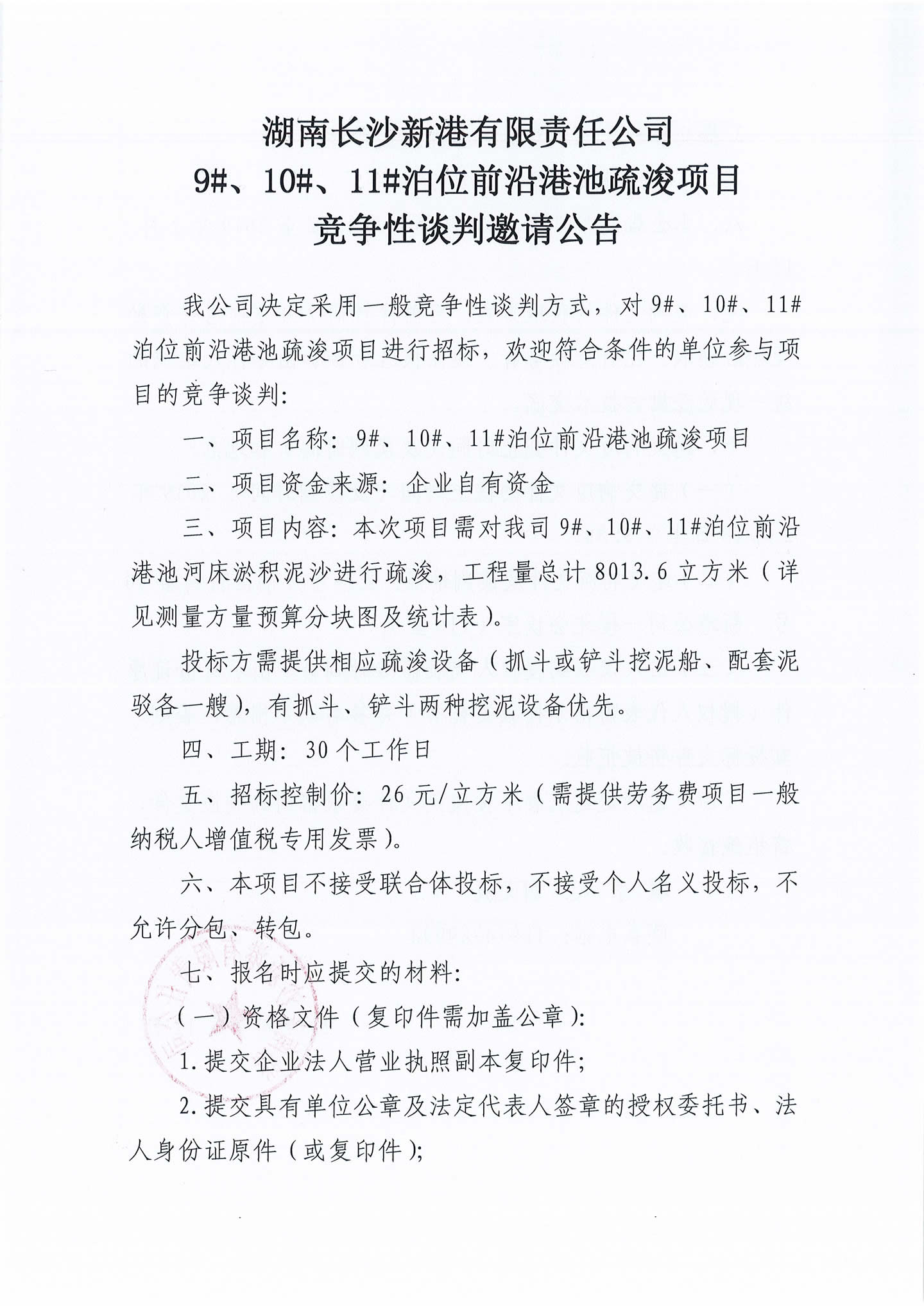 湖南長沙新港有限責(zé)任公司 9#、10#、11#泊位前沿港池疏浚項目競爭性談判邀請公告