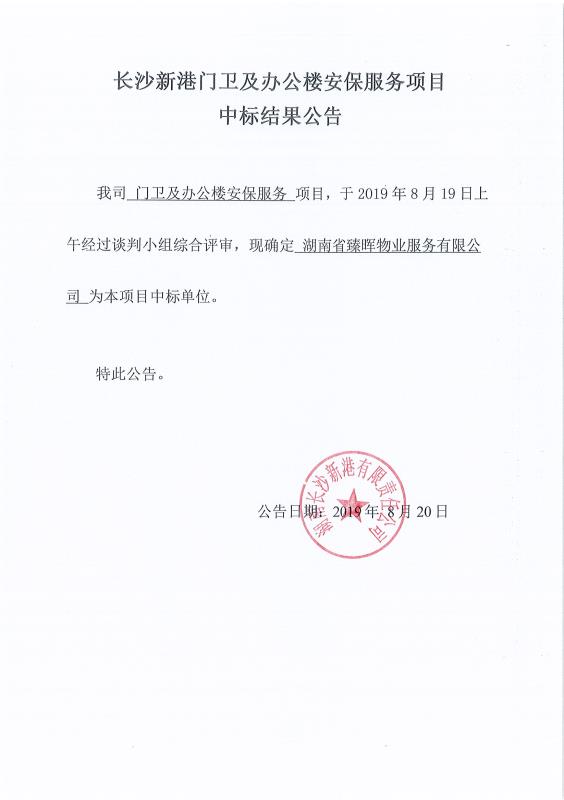 長(zhǎng)沙新港門(mén)衛(wèi)及辦公樓安保服務(wù)項(xiàng)目中標(biāo)結(jié)果公告