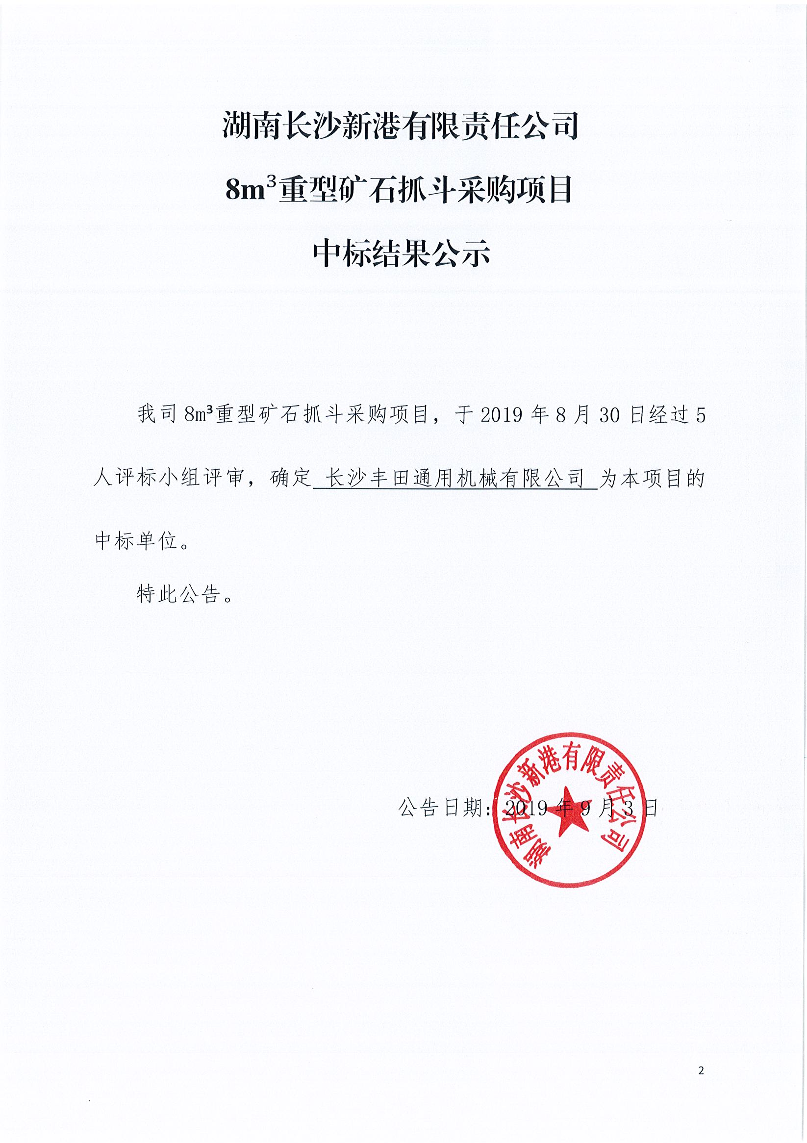 湖南長(zhǎng)沙新港有限責(zé)任公司8m³重型礦石抓斗采購(gòu)項(xiàng)目中標(biāo)結(jié)果公示