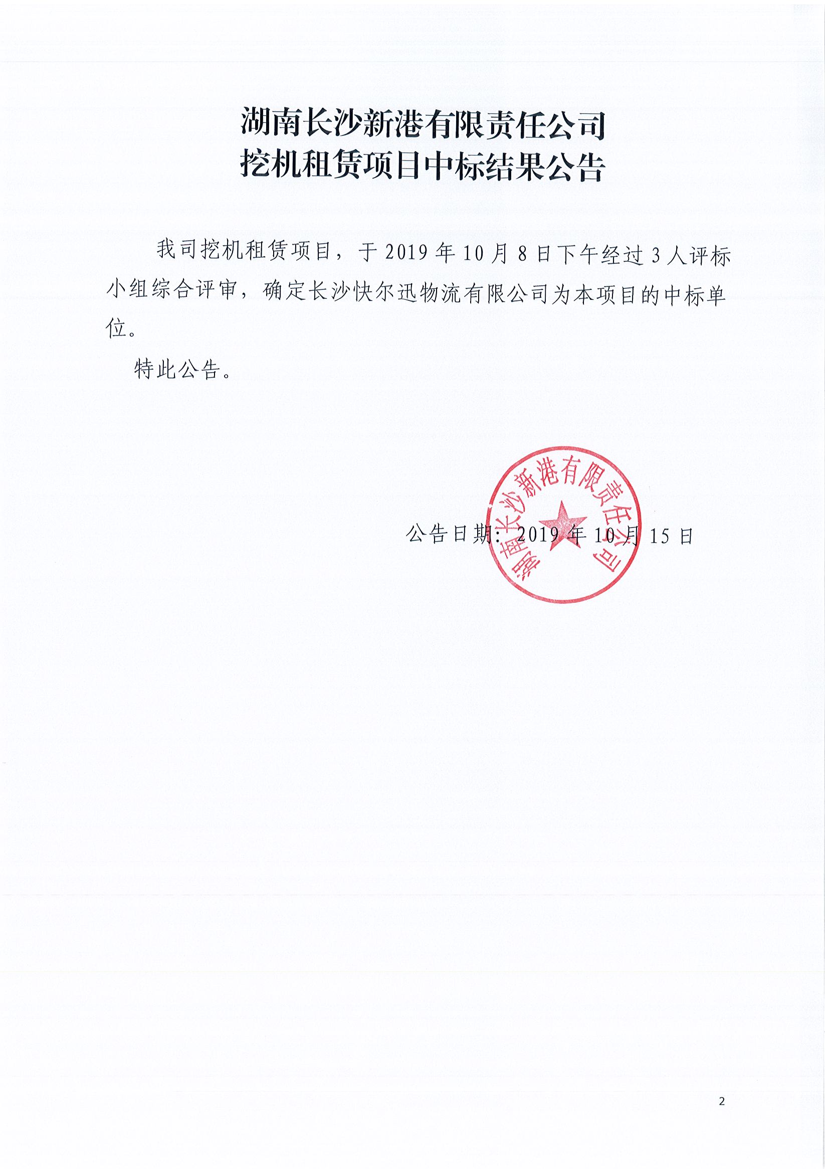 湖南長沙新港有限責(zé)任公司挖機租賃項目中標(biāo)結(jié)果公告