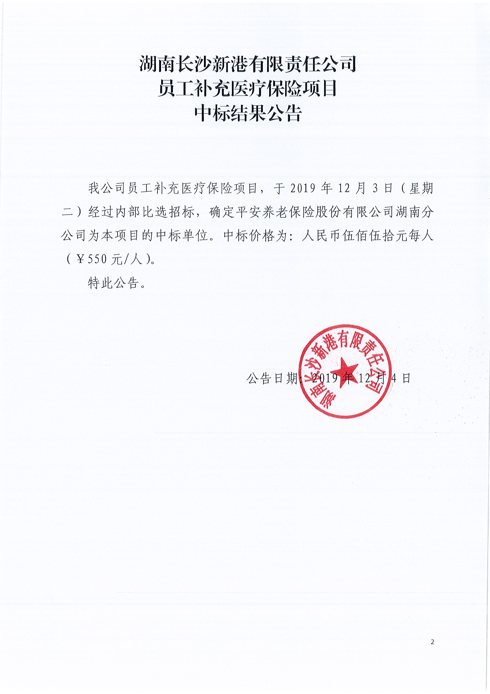 湖南長沙新港有限責任公司員工補充醫(yī)療保險項目中標結果公告