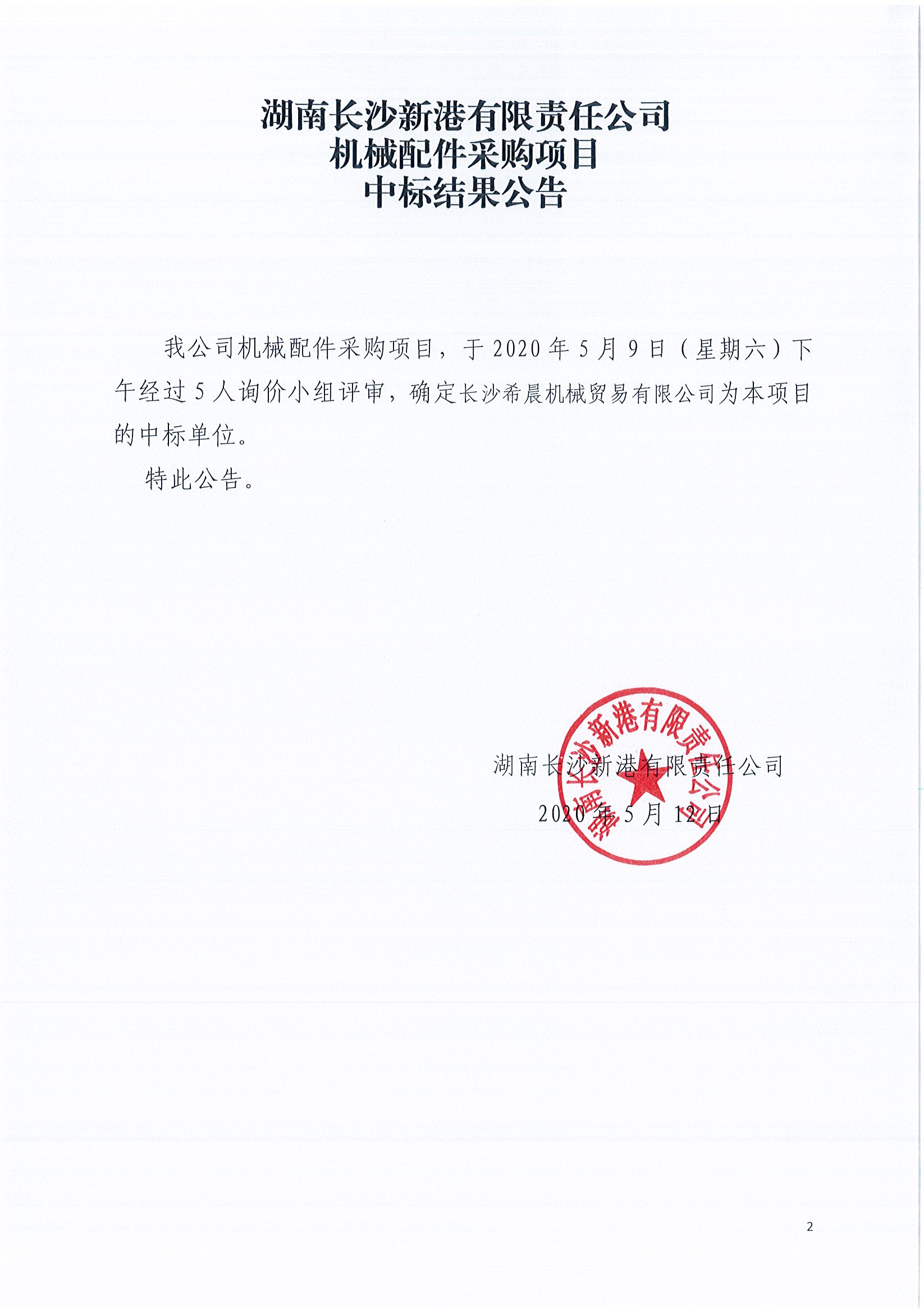 機械配件采購項目《中標結果公告》