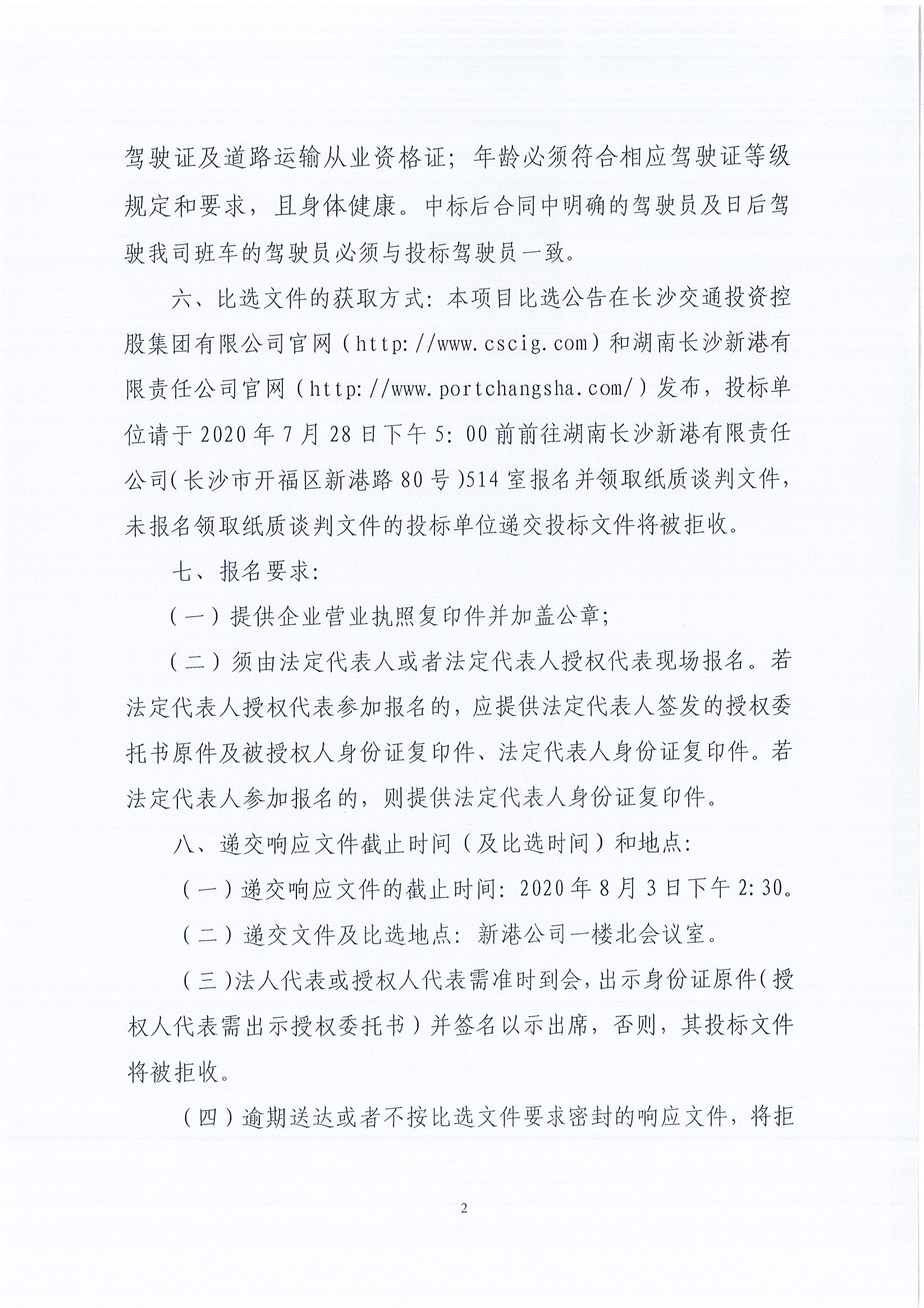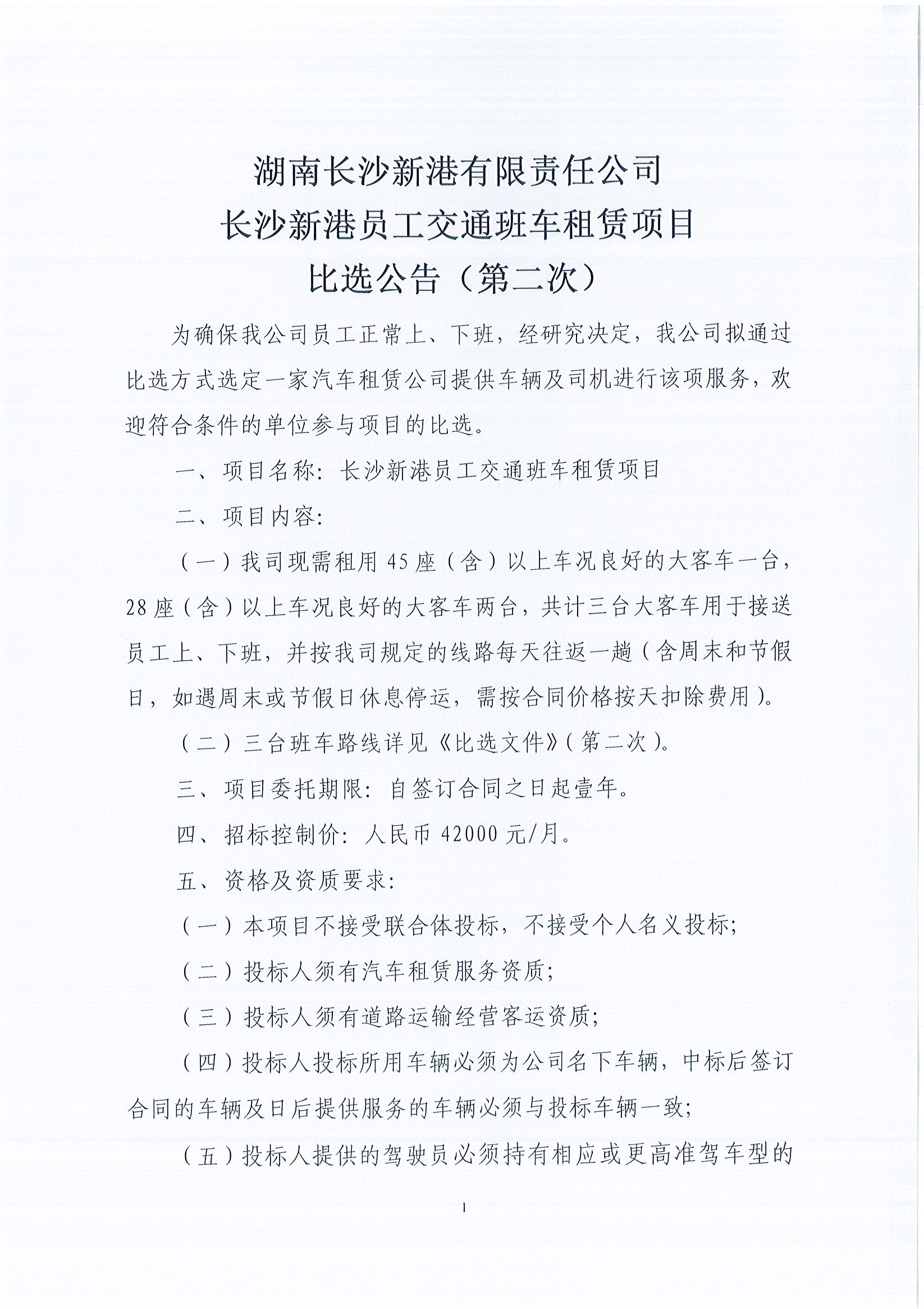 湖南長沙新港有限責(zé)任公司長沙新港員工交通班車租賃項(xiàng)目比選公告(第二次)