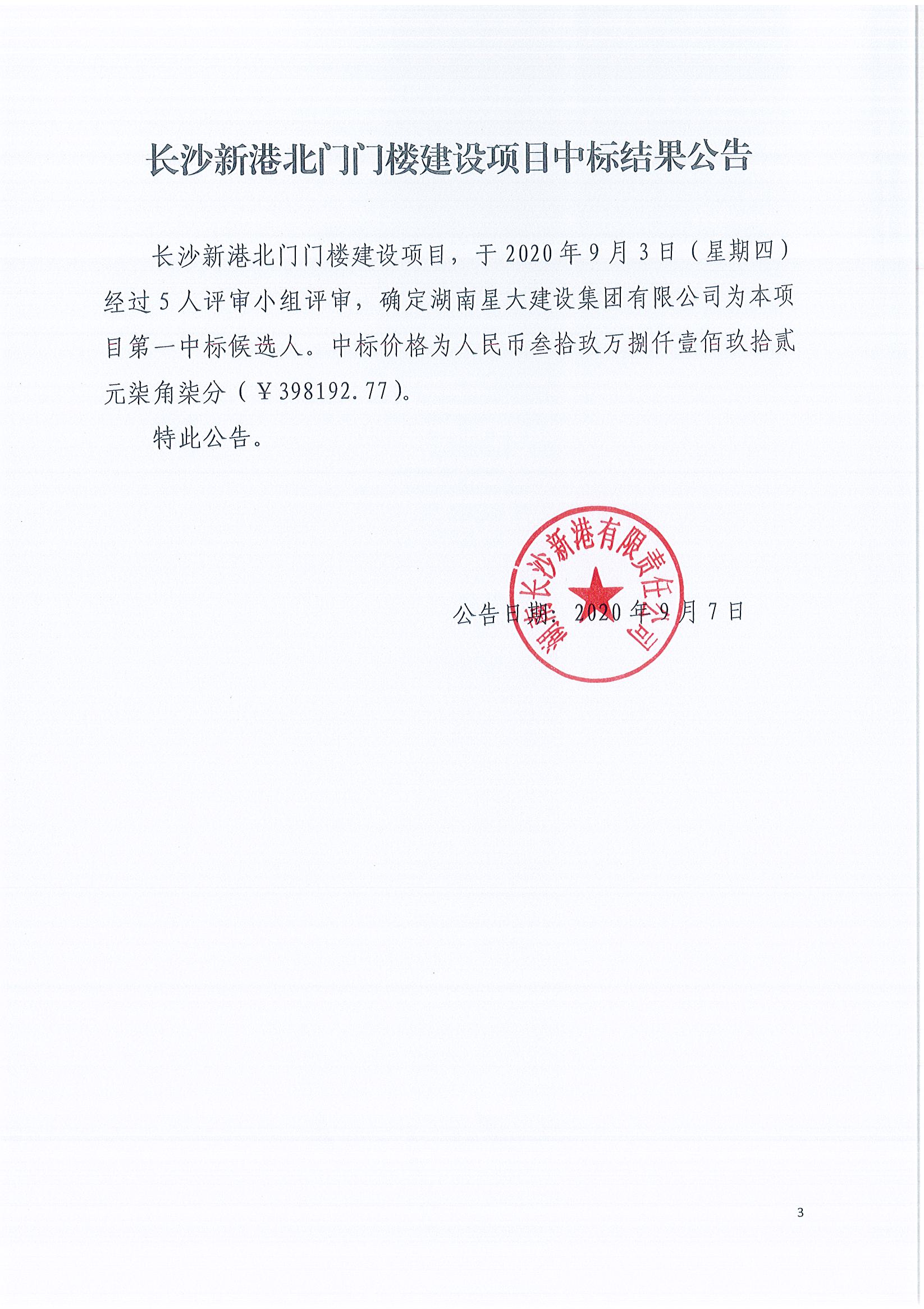 長(zhǎng)沙新港北門門樓建設(shè)項(xiàng)目中標(biāo)結(jié)果公告