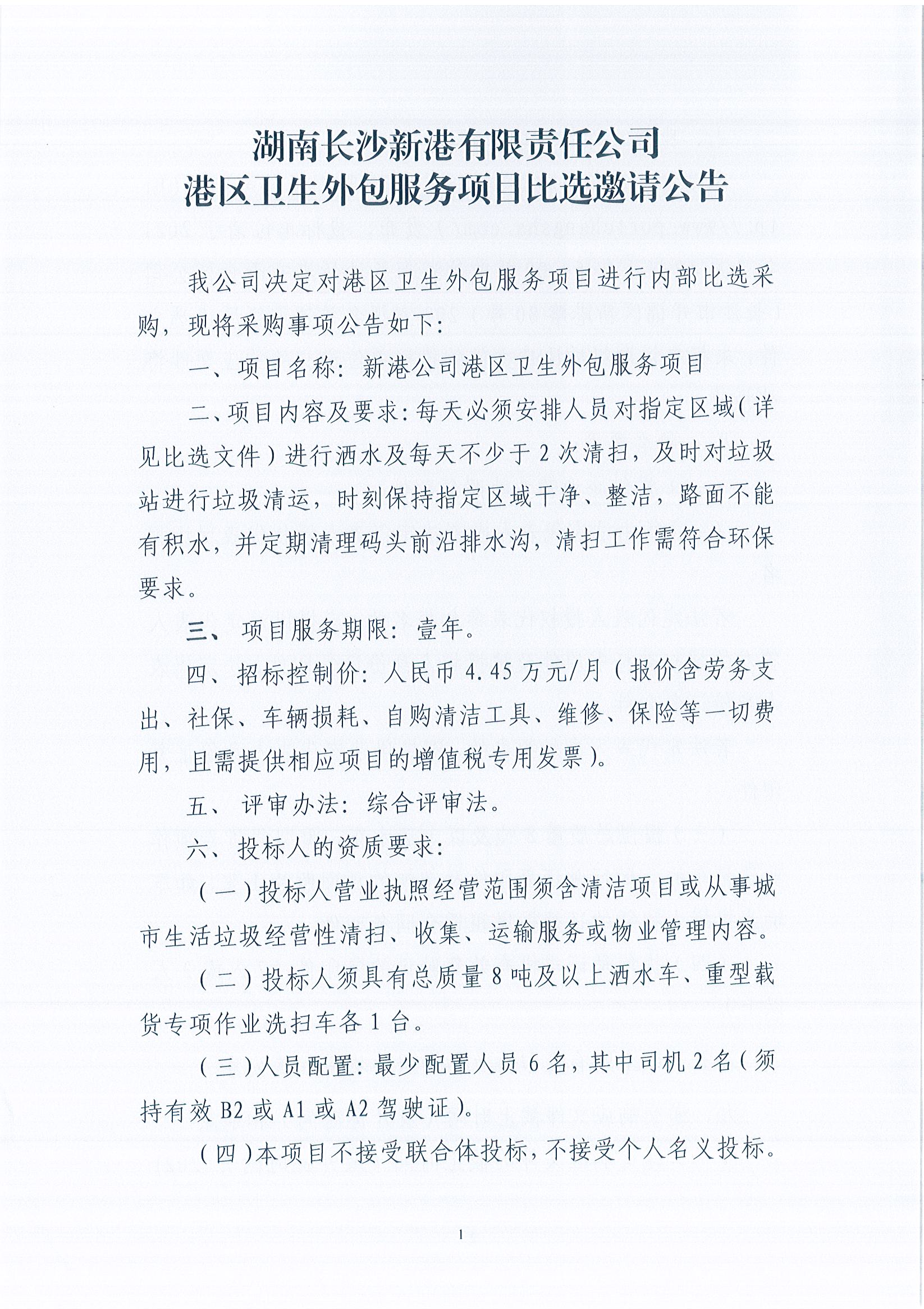 湖南長沙新港有限責(zé)任公司港區(qū)衛(wèi)生外包服務(wù)項(xiàng)目比選邀請公告