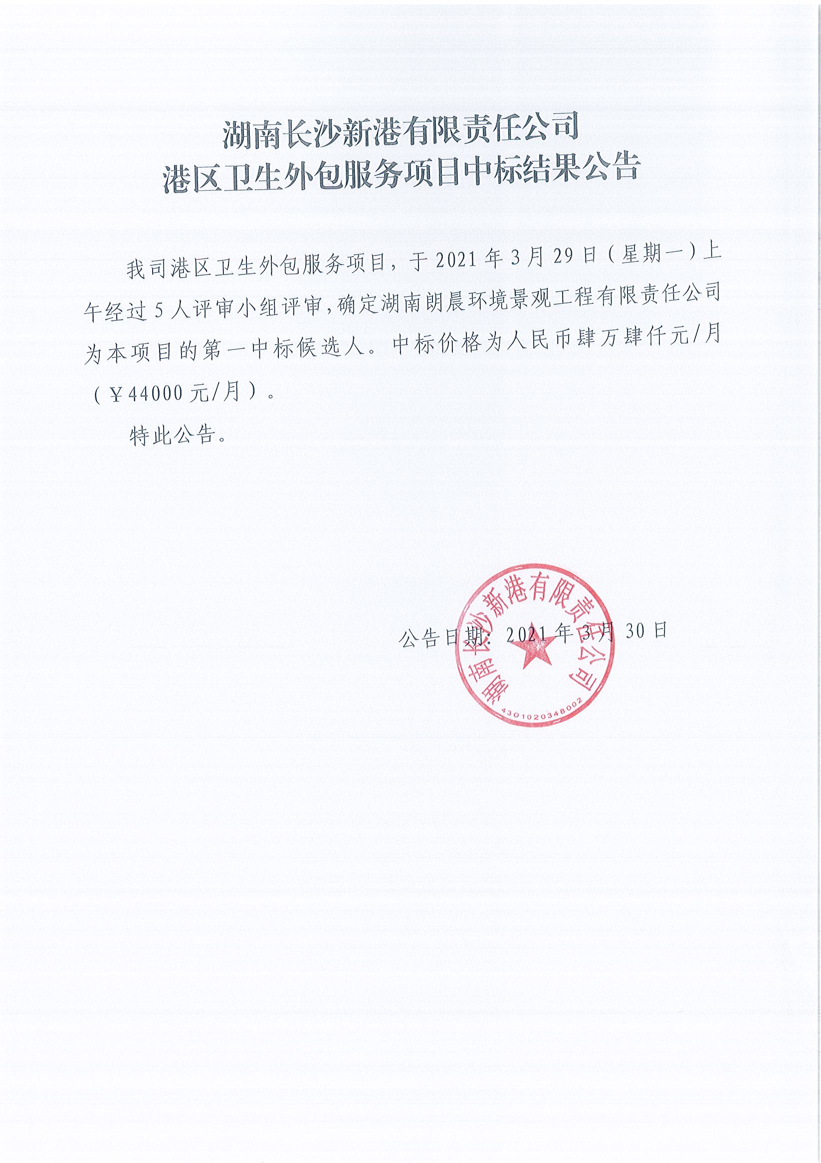 湖南長沙新港有限責(zé)任公司港區(qū)衛(wèi)生外包服務(wù)項(xiàng)目中標(biāo)結(jié)果公告