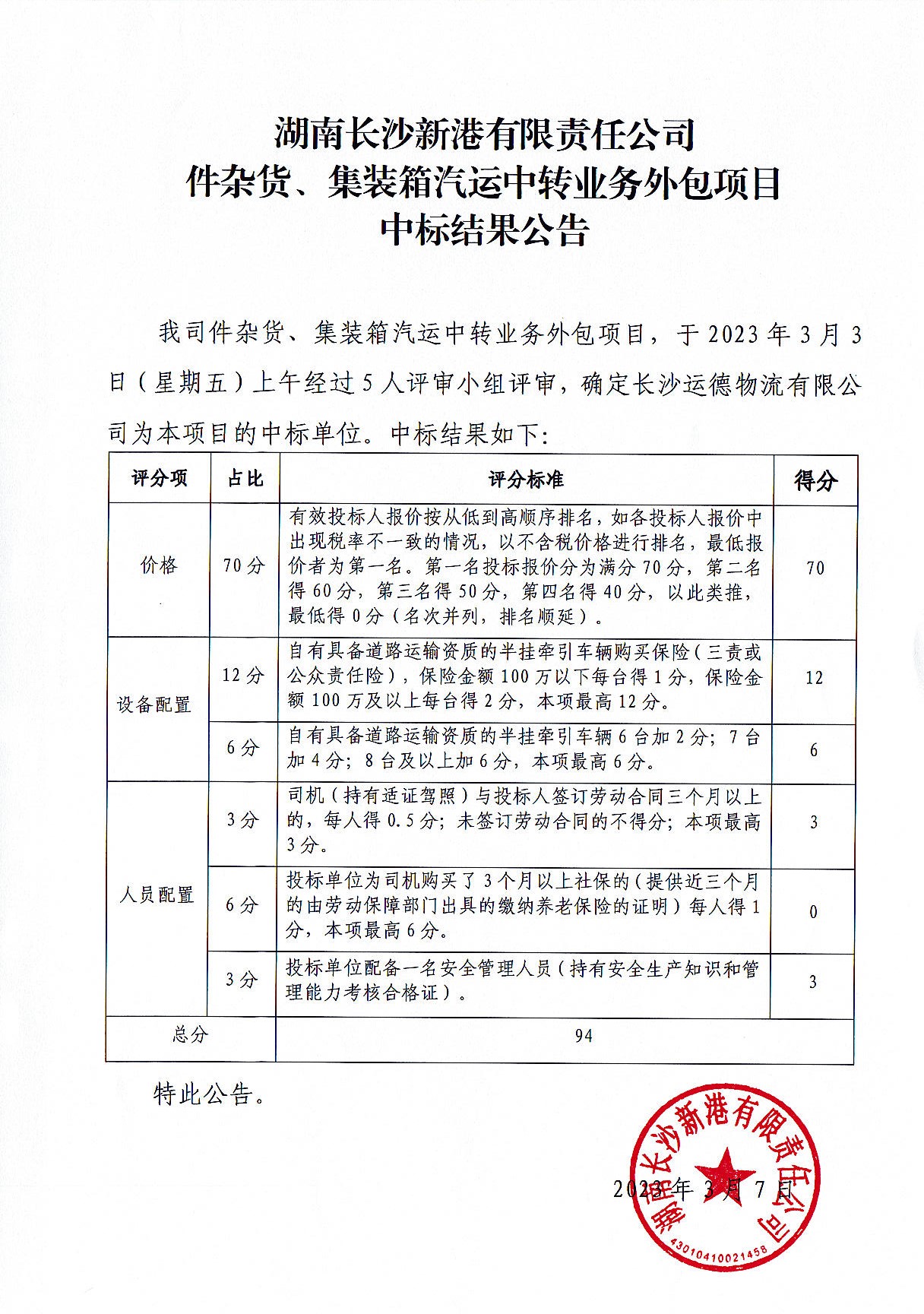 湖南長(zhǎng)沙新港有限責(zé)任公司件雜貨、集裝箱汽運(yùn)中轉(zhuǎn)業(yè)務(wù)外包項(xiàng)目中標(biāo)結(jié)果公告